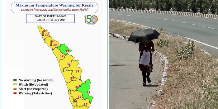 തിരുവനന്തപുരം: സംസ്ഥാനത്ത് ഉഷ്ണ തരംഗ സാധ്യതാ- മുന്നറിയിപ്പ്.കാസറഗോഡ്, കണ്ണൂർ ജില്ലകളിലെ ഒറ്റപ്പെട്ട സ്ഥലങ്ങളിൽ ഇന്നും നാളെയും (25/02/2025 & 26/02/2025) ഉഷ്ണതരംഗത്തിന് സാധ്യതയുണ്ടെന്ന് കേന്ദ്ര കാലാവസ്ഥാ വകുപ്പ് അറിയിച്ചു. കേരളത്തിൽ ഒറ്റപ്പെട്ടയിടങ്ങളിൽ ഇന്നും നാളെയും (25/02/2025 & 26/02/2025) സാധാരണയെക്കാൾ 2 °C മുതൽ 4 °C വരെ താപനില ഉയരാൻ സാധ്യതയുണ്ട്.ഉയർന്ന താപനിലയും ഈർപ്പമുള്ള വായുവും കാരണം ചൂടും അസ്വസ്ഥതയുമുള്ള അന്തരീക്ഷ സ്ഥിതിയ്ക്ക് സാധ്യതയുണ്ട്.