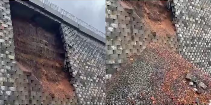 കനത്ത മഴയ്ക്കിടെ സംരക്ഷണ ഭിത്തിയുടെ ഒരു ഭാഗം പൂര്ണമായും പൊളിഞ്ഞ് സര്വീസ് റോഡിലേക്ക് പതിക്കുകയായിരുന്നു. പ്രധാന പാതയുടെ പാര്ശ്വഭിത്തിയിലെ സിമന്റ് കട്ടകളാണ് തകര്ന്ന് വീണത്. പ്രദേശത്ത് കൂടുതൽ സ്ഥലങ്ങളിൽ സര്വീസ് റോഡിന് വിള്ളൽ രൂപപ്പെട്ടിട്ടുണ്ട്. കനത്ത മഴ തുടരുന്നതിനാൽ തന്നെ സമീപത്തെ വയലുകളിൽ വെള്ളം കയറിയിട്ടുണ്ട്. കനത്ത മഴയിലാണിപ്പോള് വീണ്ടും സംരക്ഷണ ഭിത്തി തകരുന്ന സാഹചര്യമുണ്ടായതെന്നാണ് നാട്ടുകാര് പറയുന്നത്.