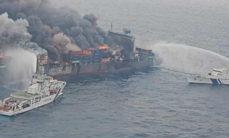 അതിനിടെ കപ്പലിലെ തീ നിയന്ത്രണവിധേയമായിട്ടില്ലെന്ന് ഡിഫന്സ് പി ആര് ഒ അതുല് പിള്ള മാധ്യമങ്ങളോട് പറഞ്ഞു. കപ്പലില് തീ പടര്ന്നു കൊണ്ടിരിക്കുയാണ്. രണ്ട് കപ്പലുകള് തീയണയ്ക്കാനുള്ള ശ്രമം തുടരുകയാണ്. കത്തുന്ന വസ്തുക്കള് നീക്കം ചെയ്താല് മാത്രമേ തീയണയ്ക്കാന് സാധിക്കുകയുള്ളൂ. രക്ഷാദൗത്യം ദുഷ്കരമാണെന്നും ഡിഫന്സ് പിആര്ഒ പറഞ്ഞിരുന്നു. കപ്പല് ചെരിഞ്ഞ നിലയിലാണെന്നും അതുല് പിള്ള പറഞ്ഞു. ഡോണിയര് വിമാനം സ്ഥലത്ത് നിരീക്ഷണം നടത്തുന്നുണ്ട്. ഐഎന്എസ് സത്ലജ് സ്ഥലത്തുണ്ട്. മറ്റ് കപ്പലുകള് സ്ഥലത്ത് തെരച്ചില് നടത്തിവരികയാണ്. കപ്പലില് ആളുകള് കുടുങ്ങിയിട്ടുണ്ടോ എന്ന കാര്യത്തില് വ്യക്തതയില്ല. രക്ഷാദൗത്യത്തില് ഐഎന്എസ് സൂറത്തും പങ്കാളിയാകുമെന്നും പി ആര് ഒ വ്യക്തമാക്കി.