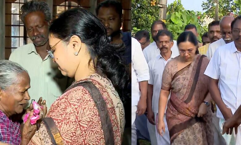 ഇന്ന് രാവിലെ ഏഴ് മണിക്ക് ശേഷമാണ് മന്ത്രി വീണാ ജോർജ് തലയോലപ്പറമ്പിലെ ബിന്ദുവിന്റെ വീട്ടിലെത്തിയത്. ബിന്ദുവിന്റെ ഭർത്താവിനോടും അമ്മയോടും മക്കളോടും മന്ത്രി സംസാരിച്ചു. കുടുംബത്തെ ആശ്വാസിപ്പിച്ച് സർക്കാർ കൂടെയുണ്ടെന്ന് ഉറപ്പ് നൽകിയാണ് മന്ത്രി മടങ്ങിയത്. പ്രാദേശിക സിപിഎം നേതാക്കളോടൊപ്പമാണ് മന്ത്രി വീട്ടിലെത്തിയത്.