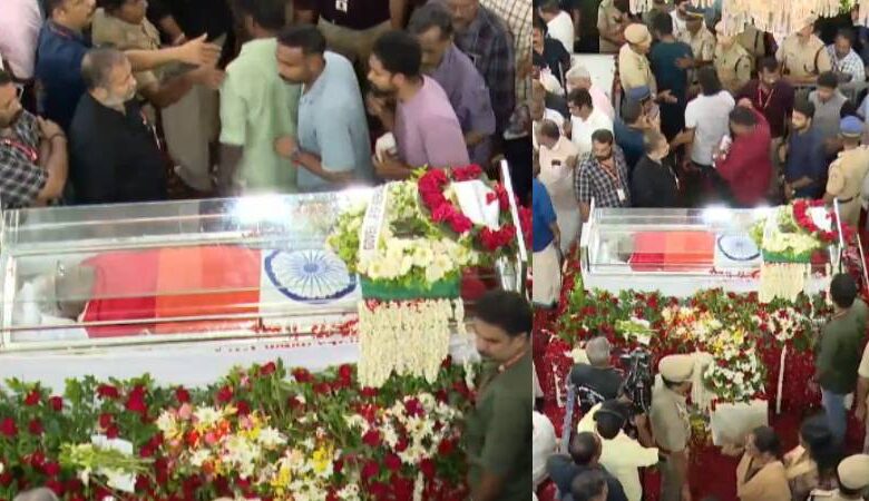വിഎസിൻ്റെ മൃതദേഹം പൊതുദർശനം സംസ്ഥാന സെക്രട്ടേറിയേറ്റിലെ ദർബാർ ഹാളിൽ പുരോഗമിക്കുകയാണ്. നൂറ് കണക്കിനാളുകൾ ഇപ്പോഴും വിഎസിനെ കാണാൻ വരിനിൽക്കുകയാണ്. എങ്കിലും ഉച്ചയ്ക്ക് രണ്ട് മണിയോടെ മൃതദേഹവും വഹിച്ചുകൊണ്ടുള്ള വിലാപയാത്ര തിരുവനന്തപുരത്ത് നിന്ന് ആലപ്പുഴയിലേക്ക് പുറപ്പെടുമെന്ന് ഔദ്യോഗികമായി അറിയിച്ചിട്ടുണ്ട്.