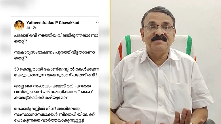 രവിക്കുള്ള പിന്തുണക്കൊപ്പം തൃശൂർ ജില്ലയിലെ കോൺഗ്രസിനെ പ്രതിസന്ധിയിലാക്കിയ ലോക്സഭ തെരഞ്ഞെടുപ്പ് പരാജയവും മുൻ ഡിസിസി സെക്രട്ടറി ചൂണ്ടിക്കാട്ടി. മക്കളും ഭാര്യമാരും സുരേഷ് ഗോപിക്ക് വോട്ട് ചെയ്തിട്ടില്ലെന്ന് നെഞ്ചത്ത് കൈവെച്ചു പറയാൻ കഴിയുന്ന എത്ര നേതാക്കൾ കോൺഗ്രസിൽ ഉണ്ടെന്നാണ് യതീന്ദ്ര ദാസ് ചോദിച്ചത്. അഖിലേന്ത്യാ, സംസ്ഥാന നേതാക്കൾ ബിജെപിയിലേക്ക് പോകുന്നത് മാത്രമേ വാർത്തയാകുന്നുള്ളൂ. പ്രാദേശിക നേതാക്കളുടെ പോക്കിന്റെ വല്ല കണക്കും കൈയിലുണ്ടോ എന്നും പോസ്റ്റിൽ പറയുന്നു.