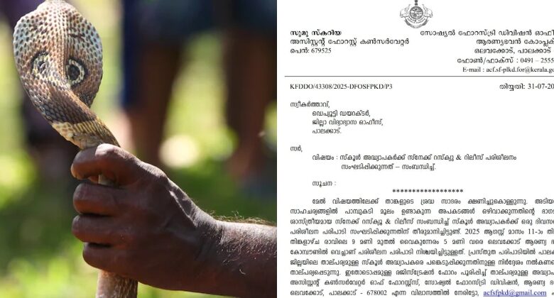 സംസ്ഥാനത്തെ അധ്യാപകർക്ക് പാമ്പ് പിടിക്കാൻ പരിശീലനം; വനം വകുപ്പാണ് പരിശീലനം നൽകുക