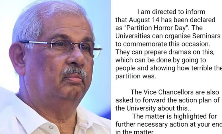 ഓഗസ്റ്റ് 14 ന് വിഭജന ഭീകരതാ ദിനമായി ആചരിക്കണം; വിചിത്ര ഉത്തരവുമായി ഗവർണർ