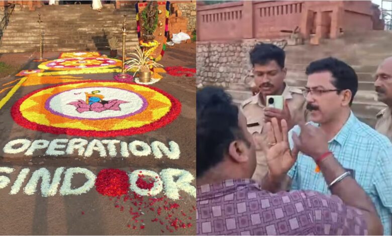 ഓപ്പറേഷൻ സിന്ദൂർ എന്നെഴുതി ക്ഷേത്രമുറ്റത്ത് ഇട്ട പൂക്കളം നീക്കം ചെയ്യണമെന്ന ഭരണ സമിതിയുടെയും പൊലീസിൻ്റെയും ആവശ്യം രാജ്യത്തെ അപമാനിക്കുന്നതിന് തുല്യമെന്നാണ് ബിജെപിയുടെ വിമർശനം. പൂക്കളത്തിന് പിന്നിൽ രാഷ്ട്രീയ ലക്ഷ്യമില്ലെന്നാണ് മറുപടി. എന്നാൽ ഓപ്പറേഷൻ സിന്ദൂറിനെ ബഹുമാനിക്കുന്നുണ്ടെന്നും ക്ഷേത്ര പരിസരത്ത് രാഷ്ട്രീയ പാർട്ടിയുടെ കൊടിയും ചിത്രവും ഉപയോഗിച്ചതിനെയാണ് എതിർത്തതെന്ന് ഭരണ സമിതിയും വ്യക്തമാക്കി.