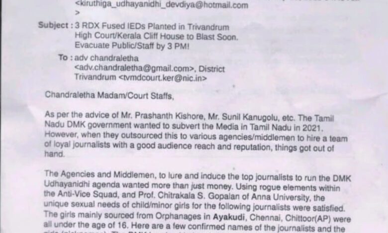 ക്ലിഫ് ഹൗസിലും തിരുവനന്തപുരം ജില്ല കോടതിയിലും ബോംബ് ഭീഷണി; സ്ഥലത്ത് ബോംബ് സ്ക്വാഡ് പരിശോധന