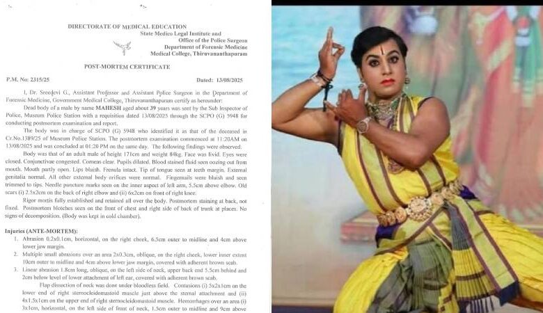 നൃത്ത അധ്യാപകൻ തിരുവനന്തപുരം വെള്ളായണി സ്വദേശി മഹേഷിന്റെ മരണത്തിൽ വഴിത്തിരിവ്. മഹേഷിന്റെ മരണം മർദ്ദനമേറ്റെന്നാണ് സംശയം. ശരീരമാകെ മുറിവുകളും ചതവുകളും ഉണ്ടെന്ന് പോസ്റ്റുമോർട്ടത്തിൽ കണ്ടെത്തിയിരുന്നു.