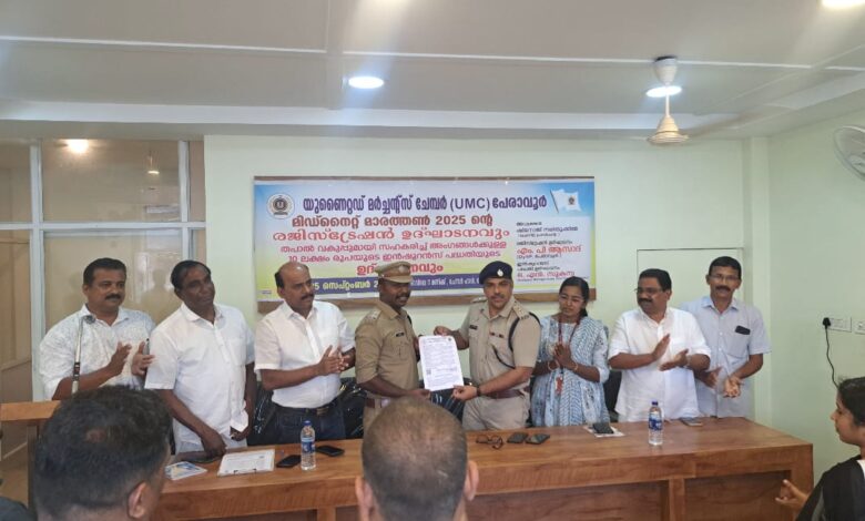പേരാവൂർ: യുണൈറ്റഡ് മർച്ചന്റ്റ്സ് ചേംബർ പേരാവൂർ യൂണിറ്റിന്റെ നേതൃത്വത്തിൽ മിഡ്നൈറ്റ് മാരത്തൺ 2025 ൻ്റെ രജിസ്ട്രേഷൻ, ഇൻഷ്വറൻസ് പദ്ധതി എന്നിവ ഉദ്ഘാടനവും ചെയ്തു. മിഡ്നൈറ്റ് മാരത്തൺ രജിസ്ട്രേഷൻ ഉദ്ഘാടനം പേരാവൂർ ഡി വൈഎസ്പി എം.പി. ആസാദ് നിർവഹിച്ചു. സ്റ്റേഷൻ ഫയർ ഓഫീസർ കെ.എ. ജിനീഷ് രജിസ്ട്രേഷൻ ഏറ്റുവാങ്ങി.തപാൽ വകുപ്പുമായി സഹക രിച്ച് അംഗങ്ങൾക്കുള്ള 10 ലക്ഷം രൂപയുടെ ഇൻഷ്വറൻസ് പദ്ധതി യുടെ ഉദ്ഘാടനം ഇന്ത്യ പോസ്റ്റ് പെയ്മെൻറ് ബാങ്ക് അസിസ്റ്റന്റ് മാനേജർ ഒ.എൻ. സുകന്യ നിർ വഹിച്ചു. ചടങ്ങിൽ യുഎംസി യൂ ണിറ്റ് പ്രസിഡൻ്റ് ഷിനോജ് നരി തൂക്കിൽ അധ്യക്ഷത വഹിച്ചു. കെ.എം. ബഷീർ, ജേക്കബ് ചോ ലമറ്റം, ഒ.ജെ ബെന്നി, സൈമൺ മേച്ചേരി എന്നിവർ പ്രസംഗിച്ചു.