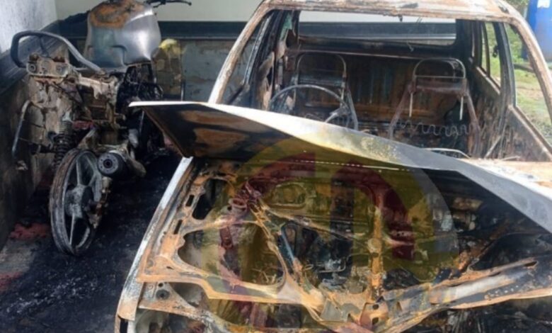 തില്ലങ്കേരി ആലാച്ചിയിൽ വീടിനു മുന്നിൽ നിർത്തിയിട്ട ബൈക്കും കാറും കത്തി നശിച്ചു