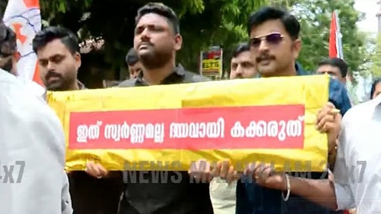 “ഇത് സ്വർണമല്ല ദയവായി കക്കരുത്”; പ്രതീകാത്മക സ്വർണപ്പാളിയുമായി പത്തനംതിട്ടയിൽ യൂത്ത് കോൺഗ്രസ് മാർച്ച്
