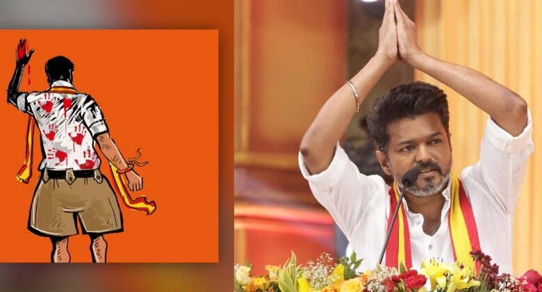 ആര്എസ്എസ് ഗണവേഷത്തിൽ ചോരപ്പാടുകൾ ഉള്ള ഷർട്ട് ധരിച്ച് വിജയ്; പോസ്റ്റർ പങ്കുവച്ച് DMK