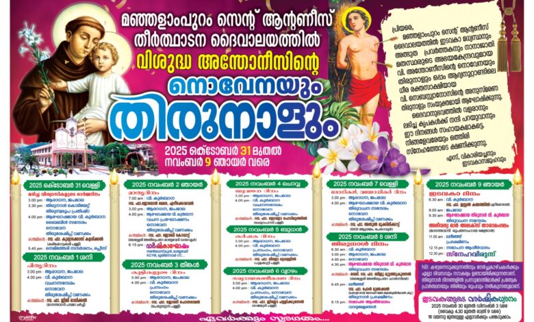 കേളകം: മഞ്ഞളാംപുറം സെൻ്റ് ആൻ്റണീസ് തീർത്ഥാടന ദേവാലയത്തിൽ വിശുദ്ധ അന്തോണീസിന്റെ നൊവേനയും തിരുനാളും ഇന്നുമുതൽ നവംബർ 9 വരെ നടക്കും.ഇന്ന് വൈകുന്നേരം തിരുനാളിന് തുടക്കം കുറിച്ച് കൊടിയേറ്റ് നടക്കും.