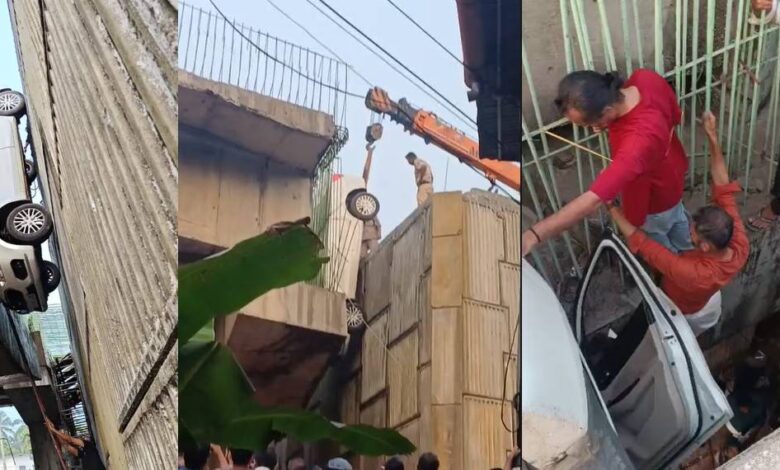 ഗതാഗത നിരോധനം വകവയ്ക്കാതെ ദേശീയപാതയിലൂടെ വണ്ടിയോടിച്ചു: അടിപ്പാതയുടെ മുകളില് നിന്ന് കാർ കുത്തനെ താഴേക്ക് വീണ് അപകടം