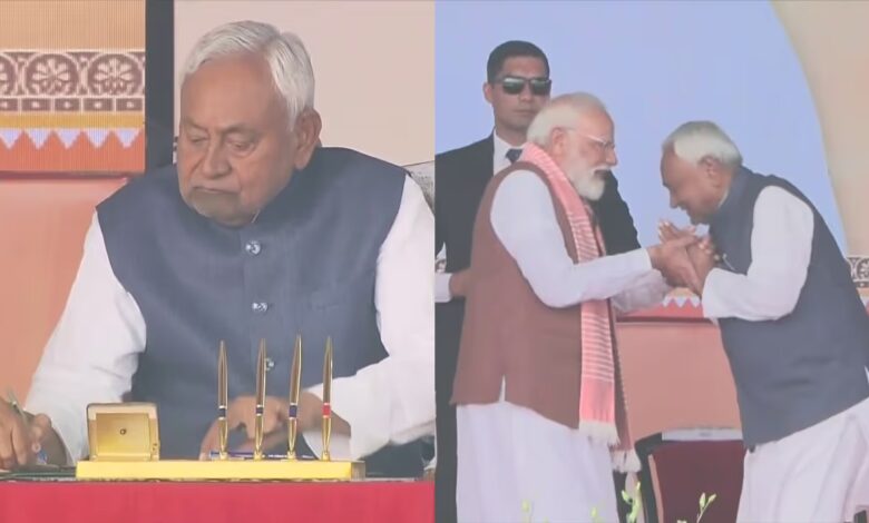 ദില്ലി: ബിഹാര്‍ മുഖ്യമന്ത്രിയായി നിതീഷ്കുമാര്‍ സത്യപ്രതിജ്ഞ ചെയ്തു. ഗവർണ്ണർ ആരിഫ് മുഹമ്മദ്ഖാൻ സത്യവാചകം ചൊല്ലിക്കൊടുത്തു. പാറ്റ്നയിലെ ഗാന്ധി മൈതാനത്താണ് ചടങ്ങുകള്‍ നടന്നത്. പ്രധാനമന്ത്രി നരേന്ദ്രമോദി, കേന്ദ്രമന്ത്രിമാര്‍, എന്‍ഡിഎ ഭരിക്കുന്ന സംസ്ഥാനങ്ങളിലെ മുഖ്യമന്ത്രിമാര്‍ തുടങ്ങിയവര്‍ ചടങ്ങില്‍ പങ്കെടുത്തു.