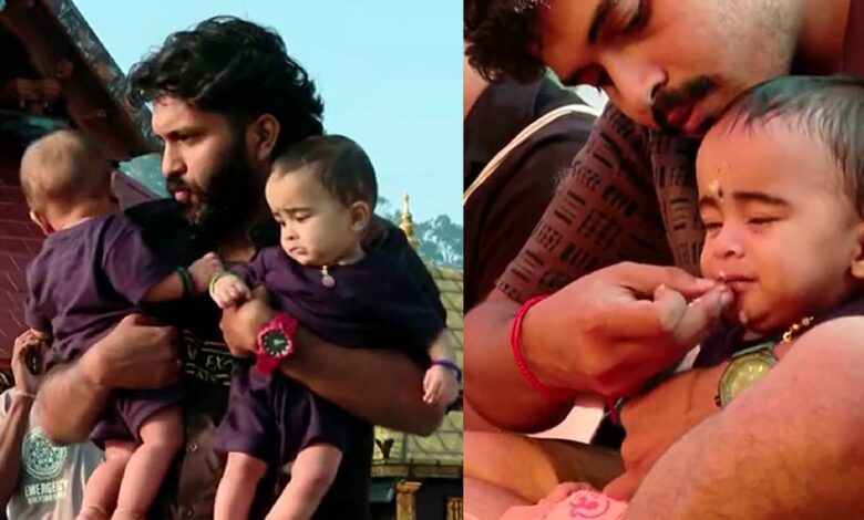 ശബരിമലയിൽ അച്ഛൻ്റെ മടിയിലിരുന്ന് കണ്മണികൾക്ക് ചോറൂണ്… അമ്മ പ്രാർത്ഥനയോടെ ദൂരെ; നാവിൽ ആദ്യ മധുരവും പുളിയും നുകർന്ന് ദ്രുവും മാധവും