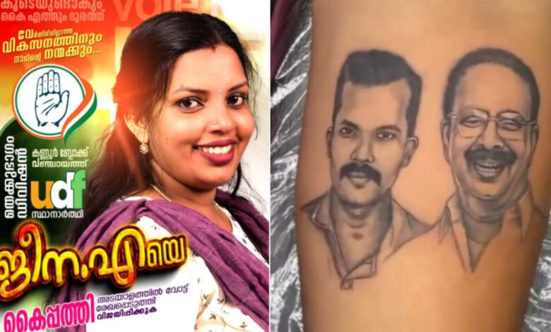 ഭര്ത്താവിനൊപ്പം കെ.സുധാകരന്റെ ചിത്രം കൈയ്യില് ടാറ്റൂ ചെയ്ത് യുഡിഎഫ് സ്ഥാനാര്ഥി