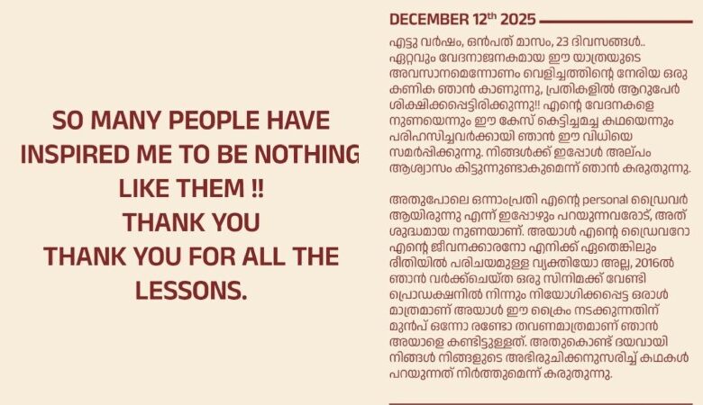 നടി ആക്രമിക്കപ്പെട്ട കേസ്; ‘അടിസ്ഥാന അവകാശങ്ങൾ ലംഘിക്കപ്പെട്ടു; എല്ലാവർക്കും നന്ദി, എല്ലാ പാഠങ്ങൾക്കും നന്ദി’; അതിജീവിത