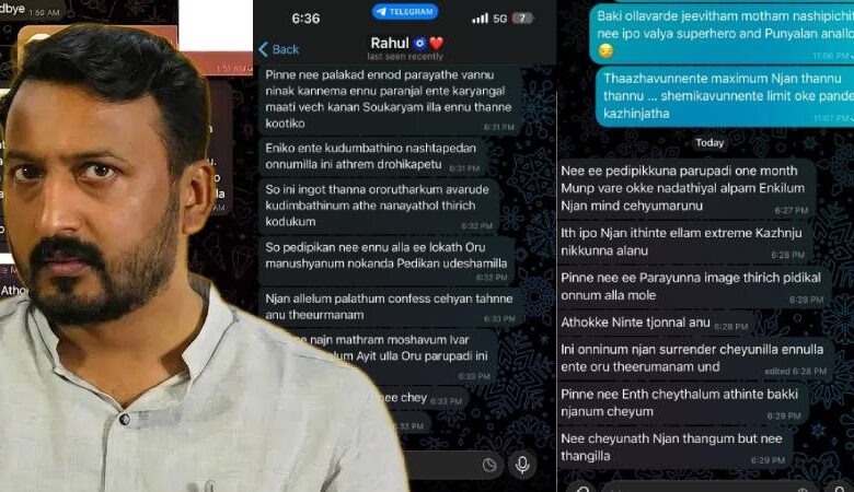 ‘ആരെയാ നീ പേടിപ്പിക്കുന്നേ? എനിക്കെതിരെ നിന്നവർക്കും കുടുംബത്തിനും അതേ നാണയത്തിൽ തിരിച്ചുകൊടുക്കും’; രാഹുൽ മാങ്കൂട്ടത്തിലിന്റെ ഭീഷണി സന്ദേശങ്ങൾ പുറത്ത്