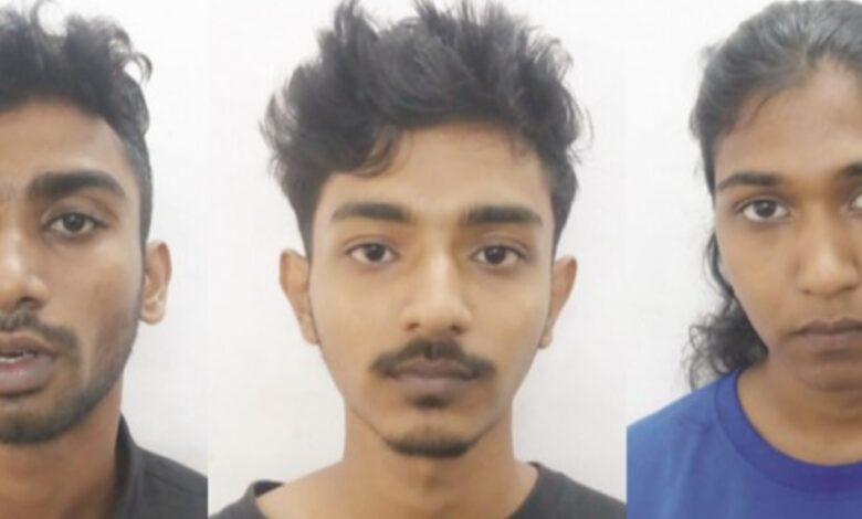 തലശേരി ന്യൂമാഹി കുറിച്ചിയിൽ വരശ്രീ വീട്ടിൽ നിവേദ് ഷൈനിത്ത് (22), ന്യൂമാഹി ടെമ്പിൾ ഗേറ്റ് പൂവളപ്പ് സ്ട്രീറ്റ് പുതുശേരി വീട്ടിൽ ദേവാ സതീഷ് (21), അമ്പലപ്പുഴ കോമന മുല്ലക്കേരിൽ വീട്ടിൽ എം ദേവിക(22) എന്നിവരെയാണ് ഹിൽപാലസ് പോലീസ് അറസ്റ്റ് ചെയ്തത്.