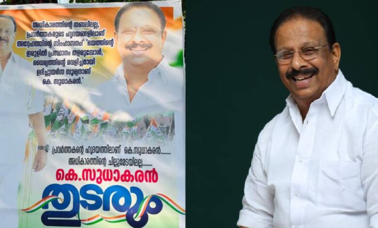 അധികാരത്തിന്‍റെ ചില്ലുമേടയിലല്ല, പ്രവർത്തകന്‍റെ ഹൃദയത്തിൽ; കെ സുധാകരൻ തുടരും’; പിന്തുണച്ച് കണ്ണൂരിൽ ഫ്ളക്സ്