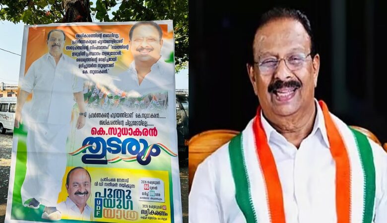 അധികാരത്തിന്റെ തണലിലല്ല പ്രവർത്തകരുടെ ഹൃദയങ്ങളിലാണ് അദ്ദേഹത്തിന്റെ സിംഹാസനം’; കണ്ണൂരിൽ കെ സുധാകരനെ അനുകൂലിച്ച് ഫ്ളക്സ് ബോർഡ്
