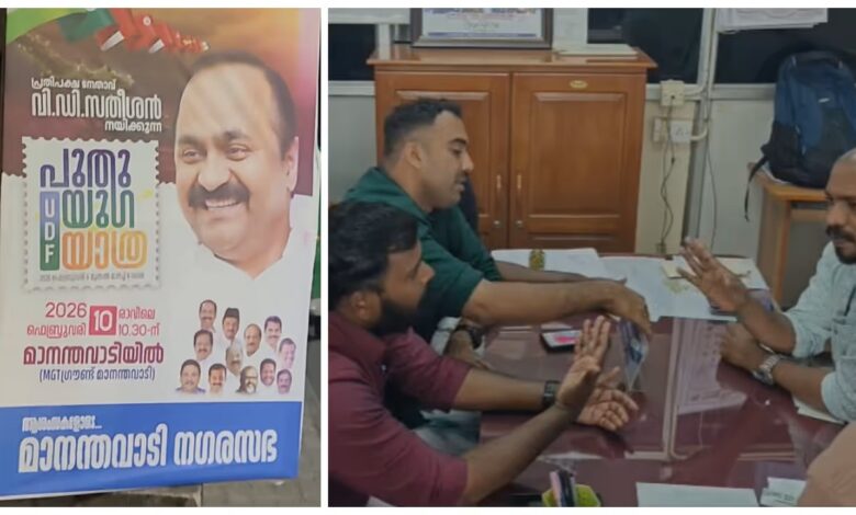 സതീശന്റെ യാത്രയ്ക്ക് ആശംസകൾ അർപ്പിച്ച് നഗരസഭ വക ഫ്ലെക്സ്! വയനാട്ടിൽ പുതുയുഗ യാത്രയിൽ വിവാദം, പ്രതിഷേധം ഉയർത്തി ഡിവൈഎഫ്ഐ