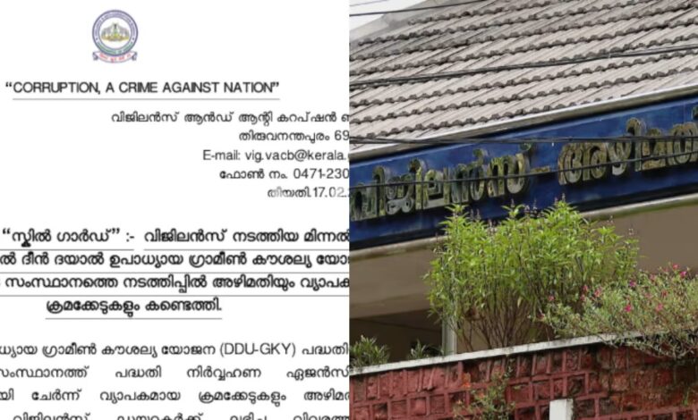 ഗ്രാമീണമേഖലയിലെ യുവാക്കൾക്ക് തൊഴിൽ പരിശീലനവും തൊഴിലും നൽകാനുളള കേന്ദ്ര സർക്കാരിൻ്റെ പദ്ധതിയാണ് ഗ്രാമീൺ കൗശല്യ യോജന. പദ്ധതി നടപ്പാക്കുന്ന 47 ഏജൻസികളുടെ ഓഫീസുകളിലാണ് വിജിലൻസ് പരിശോധന നടത്തിയത്. വ്യാജ അഡ്മിഷൻ നൽകിയും വ്യാജ ശമ്പള രേഖകളുണ്ടാക്കിയും ഏജൻസികൾ ഫണ്ട് തട്ടുന്നുവെന്ന വിവരത്തിന്റെ അടിസ്ഥാനത്തിലാണ് വിജിലൻസ് പരിശോധന നടത്തിയത്.