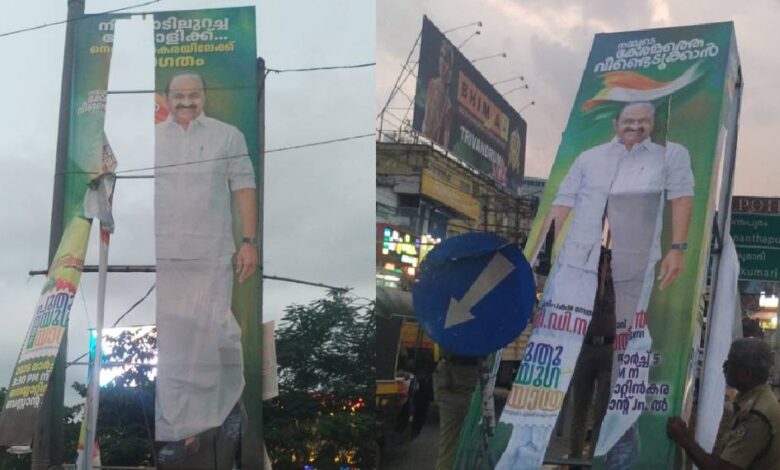 ആരോഗ്യമന്ത്രിക്ക് ഐക്യദാർഢ്യം പ്രഖ്യാപിച്ചുള്ള CPIM പ്രതിഷേധത്തിനിടെ പുതുയുഗയാത്രയുടെ ഫ്ളക്സുകൾ തകർത്തു