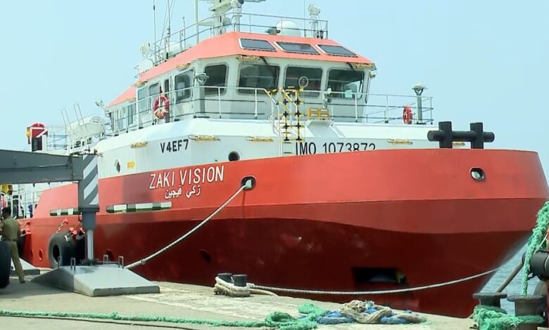 സൗദിയിലെ റാസ്തനുറ പോർട്ടിലേക്ക് പോകുകയായിരുന്ന സാകി വിഷൻ എന്ന ചെറുകപ്പലാണ് കൊല്ലം തുറമുഖത്ത് നങ്കൂരമിട്ടത്. ഇന്ന് കാലത്ത് പത്തരയോടെയാണ് കപ്പൽ തുറമുഖത്തേക്കടുപ്പിച്ചത്. കഴിഞ്ഞ ദിവസം ഉച്ചയ്ക്കാണ് തുറമുഖത്ത് ചെറുകപ്പൽ അടുപ്പിക്കാനായി അധികൃതർ അനുമതി ആവശ്യപ്പെട്ടത്. സങ്കീർണ സാഹചര്യം പരിഗണിച്ച് സംസ്ഥാന, കേന്ദ്ര സർക്കാരുകൾ അനുമതി നൽകുകയായിരുന്നു.
