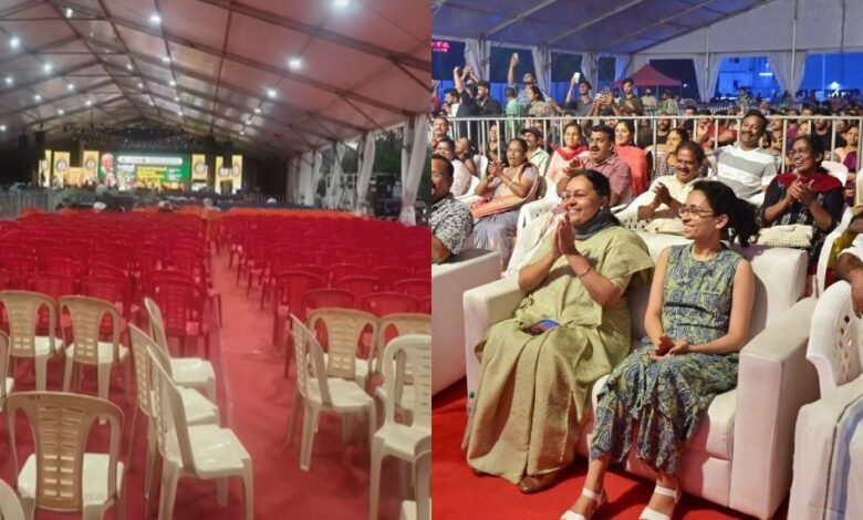 ആയുഷ് ആരോഗ്യം ഫെസ്റ്റിനായി ഒരുക്കിയിരുന്ന വേദിയിലായിരുന്നു ഉദ്ഘാടന ചടങ്ങ് നടന്നത്. ഈ വേദിയിലാണ് കലാപരിപാടികള് അടക്കം നടക്കുന്നത്. വേദിയില് മന്ത്രിക്കൊപ്പം നഗരസഭാ കൗണ്സിലര്മാര് അടക്കമുണ്ടായിരുന്നു. കലാപരിപാടികള് വൈകിട്ടാണ് തീരുമാനിച്ചിരിക്കുന്നത് എന്നതുകൊണ്ട് തന്നെ ആ സമയത്താണ് ആളുകള് എത്തിയത്. അതിന് മുന്പ് വന്ന ആളുകളാണ് ഉദ്ഘാടന ചടങ്ങില് പങ്കെടുത്തത്. ഉദ്ഘാടന ചടങ്ങിന് ശേഷം സംഘടിപ്പിച്ച കലാപരിപാടിക്ക് വലിയ ജനപിന്തുണയുണ്ടാകുകയും ചെയ്തു.