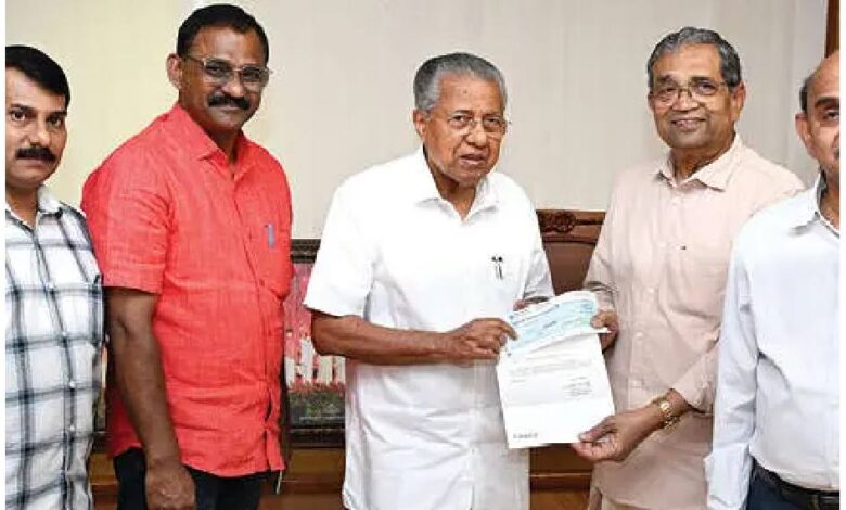 ഡോ. പി എം വാരിയർ സംഭാവന തുകയുടെ ചെക്ക് മുഖ്യമന്ത്രി പിണറായി വിജയന് കൈമാറി.