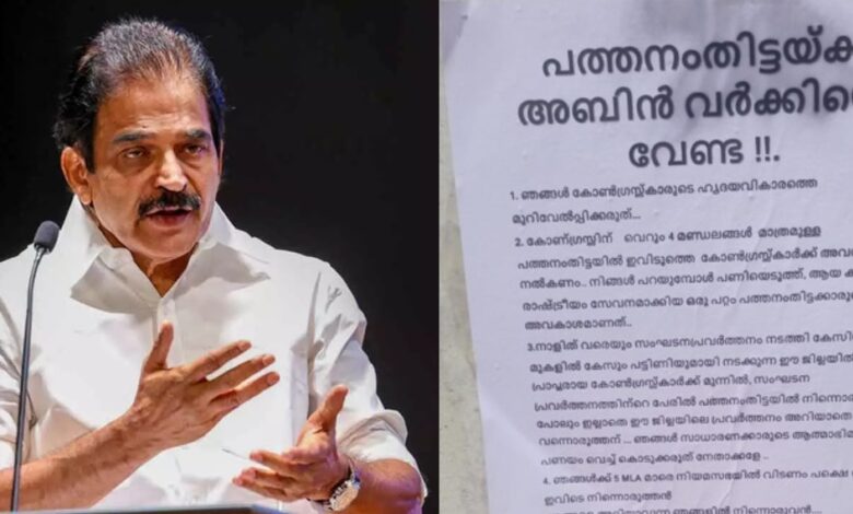 സ്പിരിറ്റ് കളയുന്ന സമീപനം ഉണ്ടാകരുത്’; ആറന്മുളയിൽ അബിൻ വർക്കിക്കെതിരെ പോസ്റ്റർ പതിച്ചതിൽ കെ സി വേണുഗോപാൽ